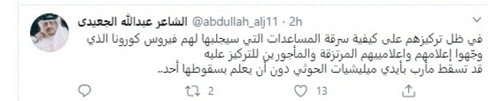 وقال في تغريدة عبر "تويتر" رصدها "المشهد العربي": "في ظل تركيزهم على كيفية سرقة المساعدات التي سيجلبها لهم فيروس كورونا الذي وجّهوا إعلامهم وإعلامييهم المرتزقة والمأجورين للتركيز عليه قد تسقط مأرب بأيدي مليشيات الحوثي دون أن يعلم بسقوطها أحد".