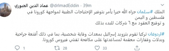وقال في تغريدة عبر "تويتر" رصدها "المشهد العربي": "الملك سلمان جزاه الله خيرًا يأمر بتوفير الاحتياجات الطبية لمواجهة كورونا في فلسطين واليمن وتوقيع العقود مع 6 شركات للبدء بذلك".