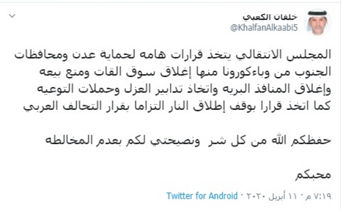 وكتب "الكعبي" في تغريدة عبر حسابه بتويتر، رصدها "المشهد العربي" قال فيها: "المجلس الانتقالي يتخذ قرارات هامة لحماية عدن ومحافظات الجنوب من وباء كورونا، منها إغلاق سوق القات ومنع بيعه وإغلاق المنافذ البرية واتخاذ تدابير العزل وحملات التوعية، كما اتخذ قرارا بوقف إطلاق النار التزاما بقرار التحالف العربي".