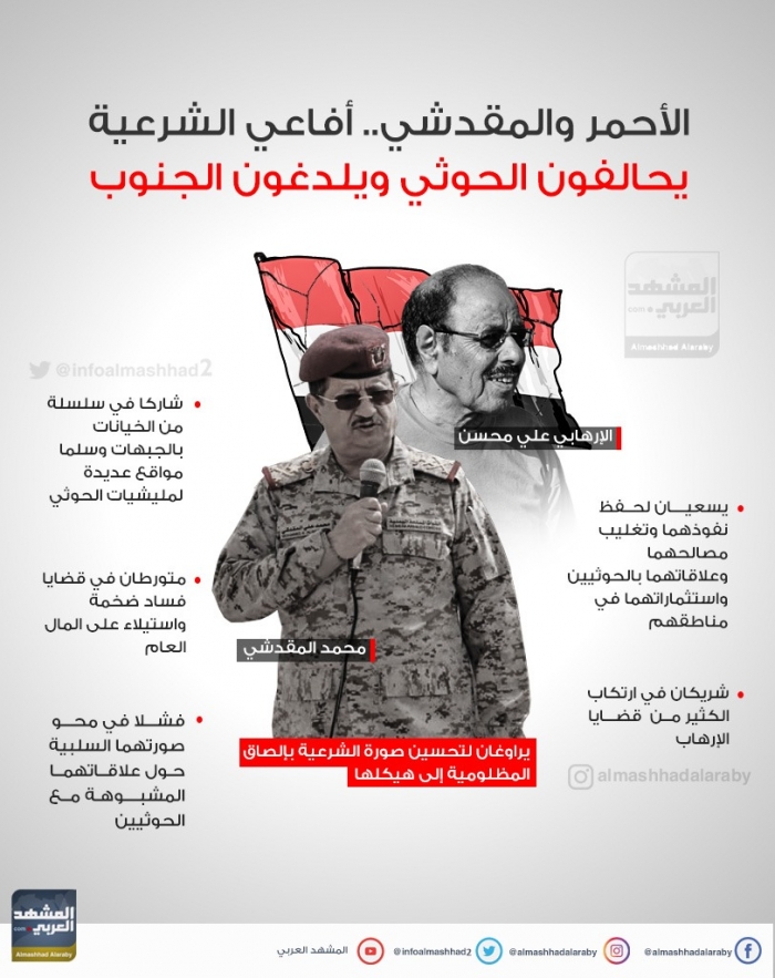 يتظاهر الجنرال الإرهابي على محسن الأحمر، ورفيقه محمد المقدشي، بقتال مليشيا الحوثي، في محاولة لإخفاء تحالف، قائم على الانسحابات مقابل تأمين استثماراتهما في مناطق مليشيا الحوثي.