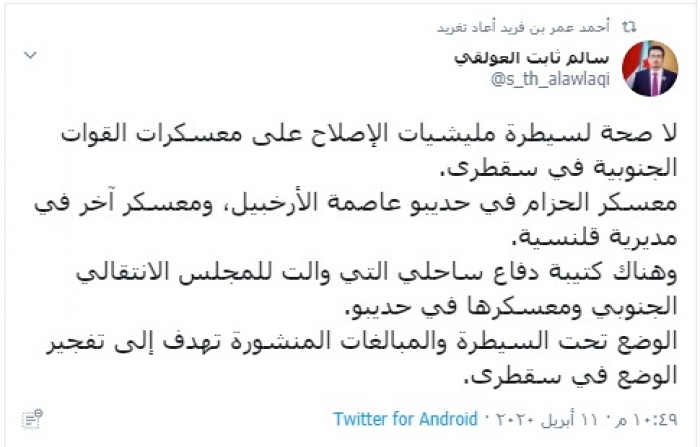 وكتب "العولقي" في تغريدة عبر حسابه بتويتر، رصدها "المشهد العربي" قال فيها: "لا صحة لسيطرة مليشيات الإصلاح على معسكرات القوات الجنوبية في سقطرى".