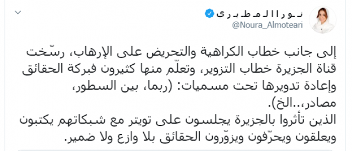 وكتبت المطيري عبر تغريدة لها على "تويتر" رصدها " المشهد العربي":"إلى جانب خطاب الكراهية والتحريض على الإرهاب، رسّخت قناة الجزيرة خطاب التزوير، وتعلّم منها كثيرون فبركة الحقائق وإعادة تدويرها تحت مسميات: (ربما، بين السطور، مصادر،..الخ)".