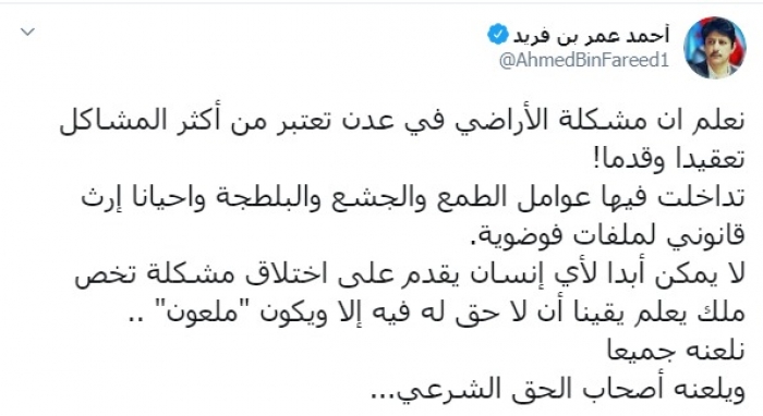 وكتب بن فريد عبر تغريدة له على "تويتر" رصدها " المشهد العربي":"نعلم إن مشكلة الأراضي في عدن تعتبر من أكثر المشاكل تعقيدا وقدما".