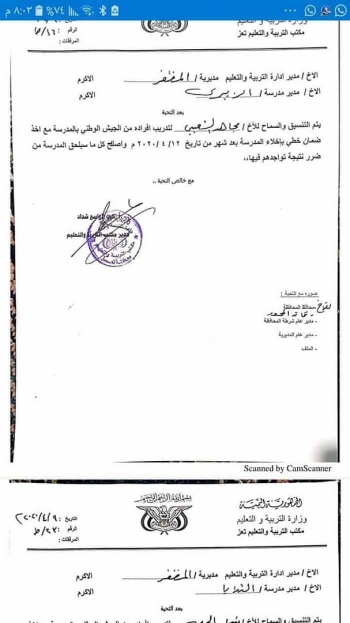 وتضمنت الوثيقة توجيهات من مدير مكتب التربية في المحافظة، التابع لمليشيا الإخوان، المدعو شداد المخلافي، إلى مدراء مدارس في مديرية المظفر، بإخلاء المدارس لعناصر المليشيا، باعتبارها مقار تدريب عناصرها.