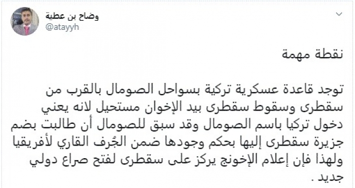 وقال في تغريدة عبر "تويتر" رصدها "المشهد العربي": "نقطة مهمة توجد قاعدة عسكرية تركية بسواحل الصومال بالقرب من سقطرى وسقوط سقطرى بيد الإخوان مستحيل لأنه يعني دخول تركيا باسم الصومال وقد سبق للصومال أن طالبت بضم جزيرة سقطرى إليها بحكم وجودها ضمن الجُرف القاري لأفريقيا ولهذا فإن إعلام الإخونج يركز على سقطرى لفتح صراع دولي جديد".