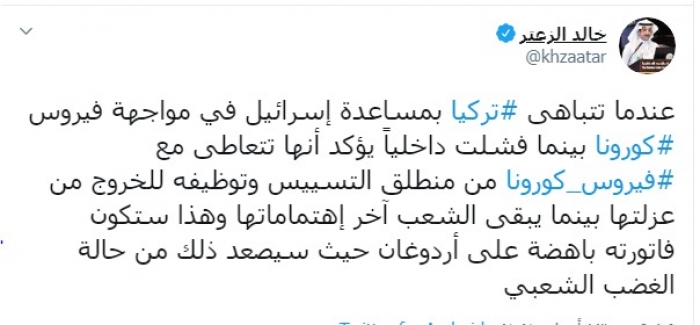 وكتب الزعتر عبر تغريدة له على "تويتر" رصدها " المشهد العربي":"عندما تتباهى تركيا بمساعدة إسرائيل في مواجهة فيروس كورونا بينما فشلت داخلياً يؤكد أنها تتعاطى مع فيروس كورونا من منطلق التسييس وتوظيفه للخروج من عزلتها ".