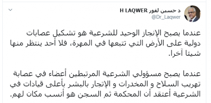 وأضاف:"عندما يصبح مسؤولي الشرعية المرتبطين أعضاء في عصابة تهريب السلاح و المخدرات والإتجار بالبشر بأعلى قيادات في الشرعية، أعتقد أن المحكمة ثم السجن هو أنسب مكان لهم".