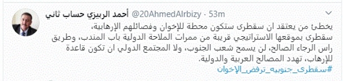 وقال في تغريدة عبر "تويتر" رصدها "المشهد العربي": "يخطئ من يعتقد أن سقطرى ستكون محطة للإخوان وفصائلهم الإرهابية، سقطرى بموقعها الاستراتيجي قريبة من ممرات الملاحة الدولية باب المندب، وطريق رأس الرجاء الصالح، لن يسمح شعب الجنوب، ولا المجتمع الدولي أن تكون قاعدة للإرهاب، تهدد المصالح العربية والدولية".