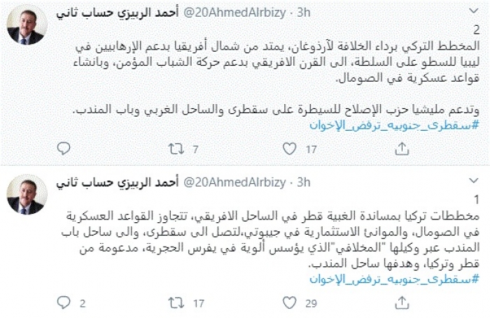 الربيزي يكشف مُخطط تركيا وقطر للسيطرة على سقطرى وباب المندب
