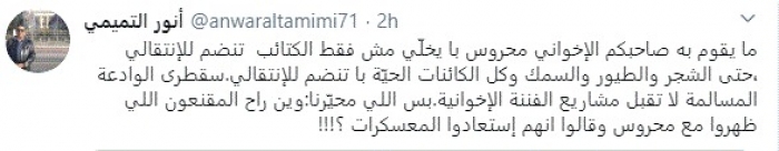 وكتب في تغريدة عبر "تويتر" رصدها "المشهد العربي": "ما يقوم به صاحبكم الإخواني محروس با يخلّي مش فقط الكتائب تنضم للانتقالي،حتى الشجر والطيور والسمك وكل الكائنات الحيّة با تنضم للانتقالي. سقطرى الوادعة المسالمة لا تقبل مشاريع الفننة الإخوانية. بس اللي محيّرنا: وين راح المقنعون اللي ظهروا مع محروس وقالوا إنهم استعادوا المعسكرات".