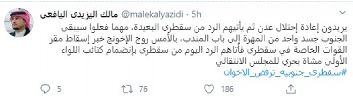 وقال في تغريدة عبر "تويتر" رصدها "المشهد العربي": "يريدون إعادة احتلال عدن ثم يأتيهم الرد من سقطرى البعيدة، مهما فعلوا سيبقى الجنوب جسد واحد من المهرة إلى باب المندب".