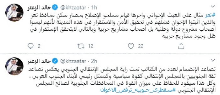 وكتب في تغريدات عبر "تويتر" رصدها "المشهد العربي": "تعز مثال على العبث الإخواني وآخرها قيام مسلحو الإصلاح بحصار سكن محافظ تعز والذين أثبتوا الإخوان فشلهم في تحقيق الأمن والاستقرار في هذه المدينة لأنهم ليسوا أصحاب مشروع دولة وطنية بل أصحاب مشاريع حزبية وبالتالي لايتحقق الاستقرار في ظل وجود مشاريع حزبية".