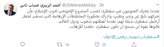 وقال في تغريدة عبر "تويتر" رصدها "المشهد العربي": "عندما يتحرك الجنوبيون في سقطرى لضرب المشروع الإخونجي لحزب الإصلاح، فإن تحركهم نابع عن وعي وطني، وإدراك بخطورة المخططات الإرهابية التي تسعى لجعل أرخبيل سقطرى بديلة لهم، بعدما لفظتهم شعوب ودول العالم. قالوها بقوة لن يسمح أن تكون سقطرى ملجأ للإرهاب".