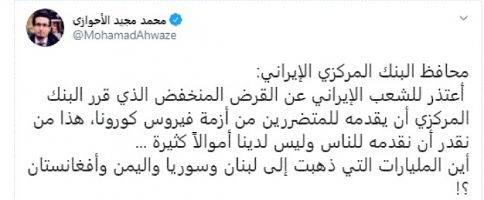 وقال في تغريدة عبر "تويتر" رصدها "المشهد العربي": "محافظ البنك المركزي الإيراني: اعتذر للشعب الإيراني عن القرض المنخفض الذي قرر البنك المركزي أن يقدمه للمتضررين من أزمة فيروس كورونا، هذا من نقدر أن نقدمه للناس وليس لدينا أموالاً كثيرة.. أين المليارات التي ذهبت إلى لبنان وسوريا واليمن وأفغانستان".