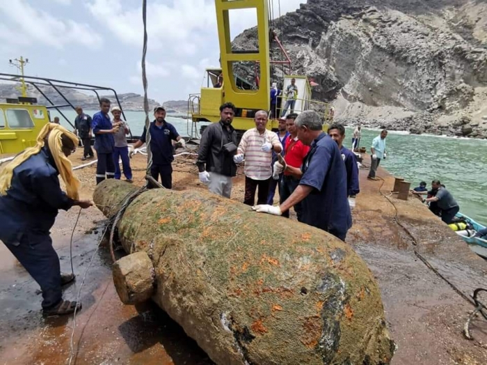 انتشلت طواقم فنية في ميناء العاصمة عدن، اليوم الثلاثاء، مدفعا تاريخيا من عهد الدولة العثمانية، غرق منذ فترة في أعماق البحر.