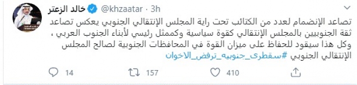 أكد المحلل السياسي السعودي خالد الزعتر، اليوم، أن انضمام عدد من الكتاب العسكرية في محافظة سقطرى إلى المجلس الانتقالي الجنوبي دليل على تصاعد الثقة لدى الجنوبيين بالمجلس.