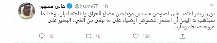 وكتب في تغريدة عبر "تويتر" رصدها "المشهد العربي": "بول بريمر اعتمد على لصوص فاسدين مؤدلجين فضاع العراق وابتلعته إيران، وهذا ما سيذهب له اليمن أن استمر اللصوص أوصياء على ما تبقى من الشيء اليسير على عروبة صنعاء ومأرب".