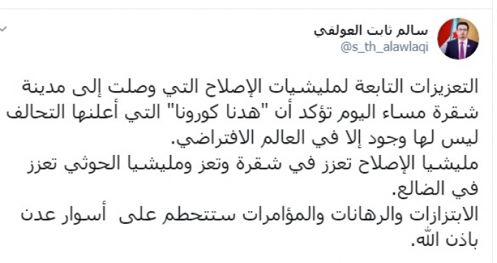 وكتب العولقي عبر تغريدة له على "تويتر" رصدها " المشهد العربي":"التعزيزات التابعة لمليشيات الإصلاح التي وصلت إلى مدينة شقرة مساء اليوم تؤكد أن "هدنة كورونا" التي أعلنها التحالف ليس لها وجود إلا في العالم الافتراضي".