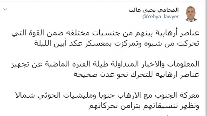 وكتب غالب عبر تغريدة له على "تويتر" رصدها " المشهد العربي":"عناصر إرهابية بينهم من جنسيات مختلفة ضمن القوة التي تحركت من شبوة وتمركزت بمعسكر عكد أبين الليلة".