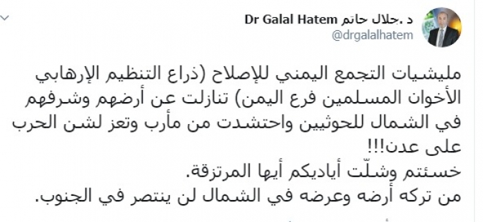 وكتب حاتم عبر تغريدة له على "تويتر" رصدها " المشهد العربي":"مليشيات التجمع اليمني للإصلاح (ذراع التنظيم الإرهابي الإخوان المسلمين فرع اليمن) تنازلت عن أرضهم وشرفهم في الشمال للحوثيين واحتشدت من مأرب وتعز لشن الحرب على عدن".