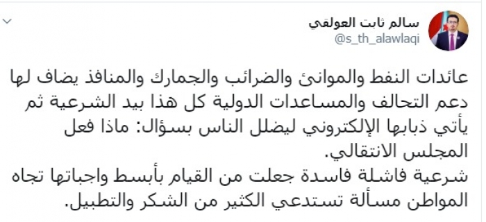 وأضاف:"شرعية فاشلة فاسدة جعلت من القيام بأبسط واجباتها تجاه المواطن مسألة تستدعي الكثير من الشكر والتطبيل".