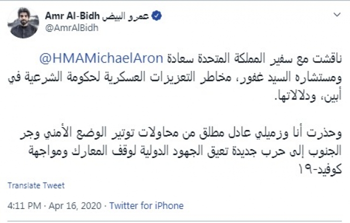 ولفت في تغريدة على حسابه الشخصي بموقع "تويتر"، اليوم الخميس، إلى تواصله "مع سفير المملكة المتحدة، مايكل آرون، ومستشاره السيد غفور، لبحث مخاطر التعزيزات العسكرية لحكومة الشرعية في أبين"، مشيرا إلى أنهما بحثا "دلالاتها".