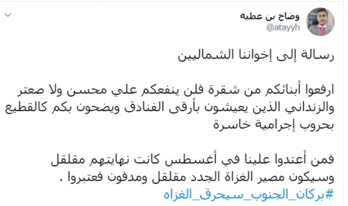 وكتب بن عطية عبر تغريدة له على "تويتر" رصدها " المشهد العربي":"رسالة إلى إخواننا الشماليين،ارفعوا أبنائكم من شقرة فلن ينفعكم علي محسن ولا صعتر والزنداني الذين يعيشون بأرقى الفنادق ويضحون بكم كالقطيع بحروب إجرامية خاسرة".