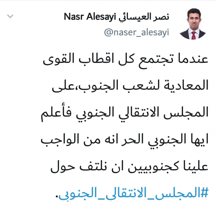 وكتب "العيسائي" في تغريدة عبر حسابه الشخصي بتويتر، رصدها" المشهد العربي" : "عندما تجتمع كل أقطاب القوى المعادية لشعب الجنوب، على المجلس الانتقالي الجنوبي فاعلم أيها الجنوبي الحر أنه من الواجب علينا كجنوبيين أن نلتف حول #المجلس _ الانتقالي _ الجنوبي.
