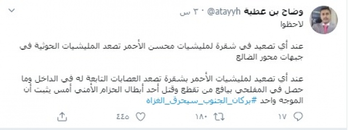 وكتب "بن عطية" في تغريدة رصدها "المشهد العربي" قال فيها: "لاحظواعند أي تصعيد في شقرة لمليشيات محسن الأحمر، تصعد المليشيات الحوثية في جبهات محور الضالع".