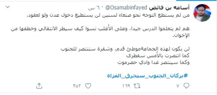وكتب "بن فائض" في تغريدة عبر تويتر، رصدها "المشهد العربي": "من لم يستطع التوجه نحو صنعاء لسنين لن يستطيع دخول عدن ولو لعقود".