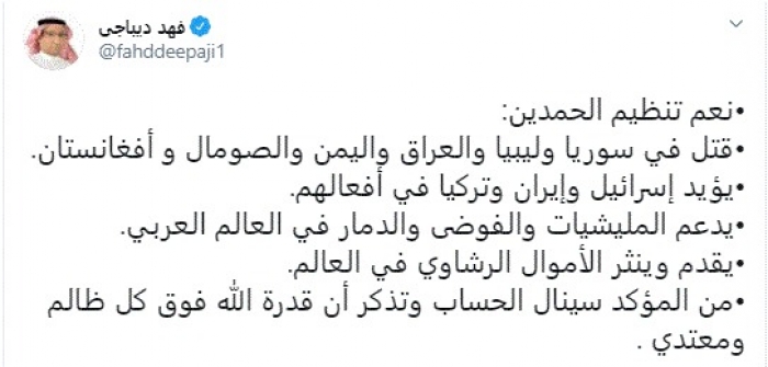وقال في تغريدة عبر "تويتر" رصدها "المشهد العربي": "نعم تنظيم الحمدين: قتل في سوريا وليبيا والعراق واليمن والصومال و أفغانستان، يؤيد إسرائيل وإيران وتركيا في أفعالهم".