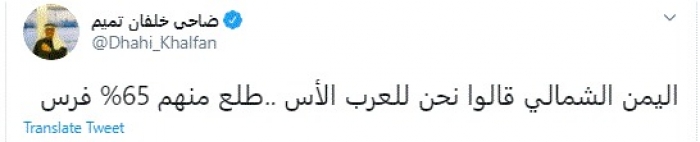 وقال في تغريدة عبر "تويتر" رصدها "المشهد العربي": "اليمن الشمالي قالوا نحن للعرب الأس ..طلع منهم 65% فرس".