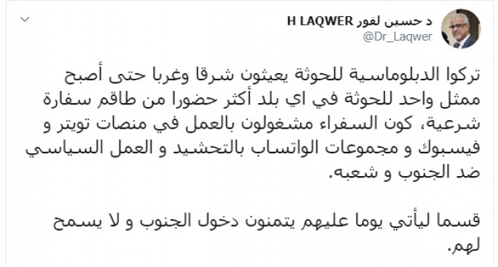 وأضاف:" كون السفراء مشغولون بالعمل في منصات تويتر و فيسبوك و مجموعات الواتساب بالتحشيد و العمل السياسي ضد الجنوب و شعبه".