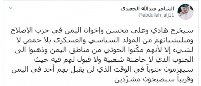 وكتب الجعيدي عبر تغريدة له على "تويتر" رصدها " المشهد العربي":"سيخرج هادي وعلي محسن وإخوان اليمن في حزب الإصلاح وميليشياتهم من المولد السياسي والعسكري بلا حمص لا لشيء إلا لأنهم مكّنوا الحوثي من مناطق اليمن".