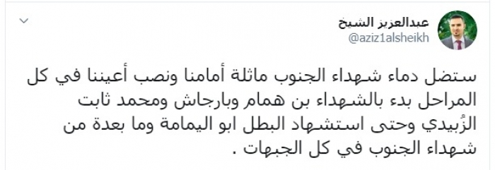 وكتب الشيخ عبر تغريدة له على :تويتر" رصدها " المشهد العربي":"ستظل دماء شهداء الجنوب ماثلة أمامنا ونصب أعيننا في كل المراحل بدءا بالشهداء بن همام وبارجاش ومحمد ثابت الزُبيدي وحتى استشهاد البطل أبو اليمامة وما بعده من شهداء الجنوب في كل الجبهات" .