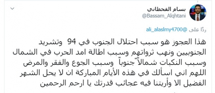 قال الإعلامي بسام القحطاني،اليوم الجمعة، إن الإرهابي علي محسن الأحمر تسبب في عدة مصائب لشعب الجنوب.