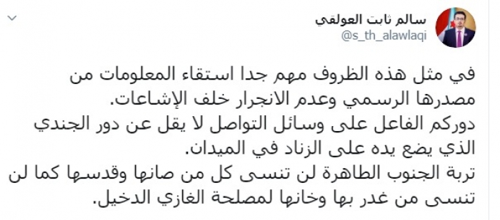 وكتب العولقي عبر تغريدة له على "تويتر" رصدها " المشهد العربي":"في مثل هذه الظروف مهم جدا استقاء المعلومات من مصدرها الرسمي وعدم الانجرار خلف الإشاعات".