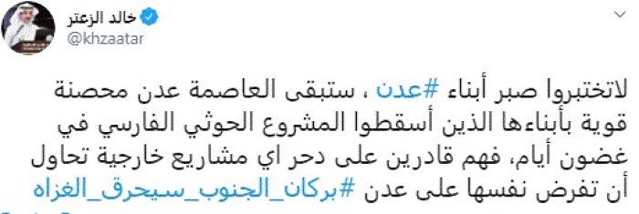 وكتب في تغريدة عبر "تويتر" رصدها "المشهد العربي": "لا تختبروا صبر أبناء عدن، ستبقى العاصمة عدن محصنة قوية بأبناءها الذين أسقطوا المشروع الحوثي الفارسي في غضون أيام، فهم قادرين على دحر أي مشاريع خارجية تحاول أن تفرض نفسها على عدن".