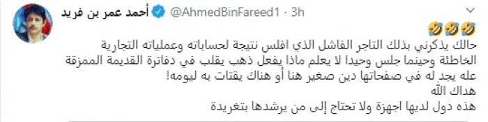 وقال في تغريدة عبر "تويتر" رصدها "المشهد العربي": "حالك يذكرني بذلك التاجر الفاشل الذي أفلس نتيجة لحساباته وعملياته التجارية الخاطئة وحينما جلس وحيدًا لا يعلم ماذا يفعل ذهب يقلب في دفاترة القديمة الممزقة عله يجد له في صفحاتها دين صغير هنا أو هناك يقتات به ليومه!.. هداك الله هذه دول لديها أجهزة ولا تحتاج إلى من يرشدها بتغريدة".
