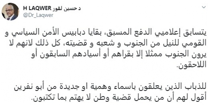 وقال في تغريدة عبر "تويتر" رصدها "المشهد العربي": "يتسابق إعلاميي الدفع المسبق، بقايا دبابيس الأمن السياسي والقومي للنيل من الجنوب وشعبه وقضيته، كل ذلك لأنهم لا يرون الجنوب ممثلا إلا بقراهم أو أسيادهم السابقون أو اللاحقون".