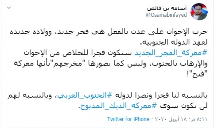 وكتب "بن فائض" في تغريدة عبر حسابه بتويتر، رصدها "المشهد العربي" قال فيها: "حرب الإخوان على عدن بالفعل هي فجر جديد، وولادة جديدة لعهد الدولة الجنوبية".