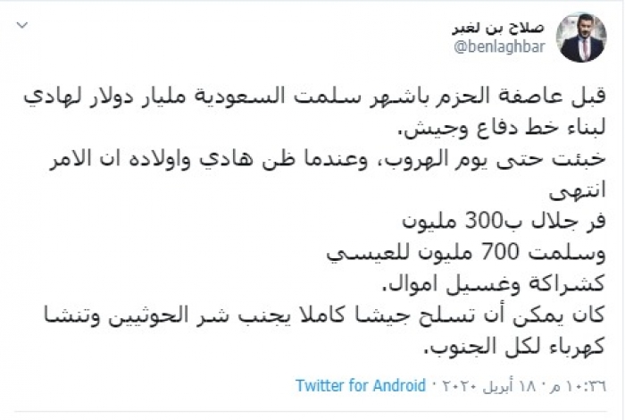 وكتب "بن لغبر" في تغريدة عبر حسابه بتويتر، رصدها "المشهد العربي" قال فيها: "قبل عاصفة الحزم بأشهر سلمت السعودية مليار دولار لهادي لبناء خط دفاع وجيش، خبئت حتى يوم الهروب، وعندما ظن هادي وأولاده أن الأمر انتهى".