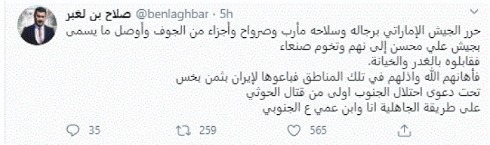 وأضاف: "فأهانهم الله وأذلهم في تلك المناطق فباعوها لإيران بثمن بخس تحت دعوى احتلال الجنوب أولى من قتال الحوثي على طريقة الجاهلية أنا وابن عمي على الجنوبي".