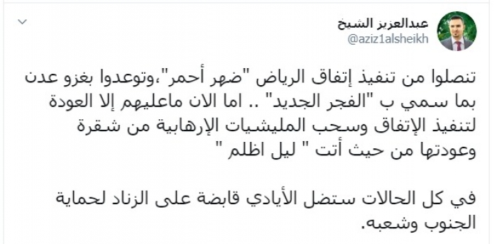 وكتب الشيخ عبر تغريدة له على "تويتر" رصدها " المشهد العربي":"تنصلوا من تنفيذ اتفاق الرياض "ضهر أحمر"،وتوعدوا بغزو عدن بما سمي بـ "الفجر الجديد"، أما الآن ما عليهم إلا العودة لتنفيذ الاتفاق وسحب المليشيات الإرهابية من شقرة وعودتها من حيث أتت " ليل أظلم ".