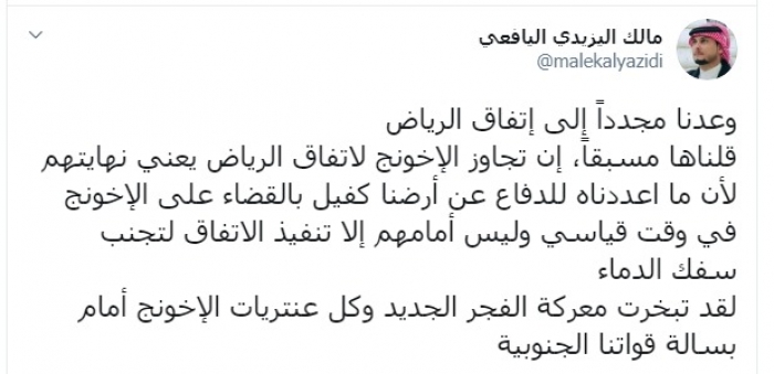 وكتب اليافعي عبر تغريدة له على " تويتر" رصدها" المشهد العربي":"وعدنا مجدداً إلى اتفاق الرياض، قلناها مسبقاً، إن تجاوز الإخونج لاتفاق الرياض يعني نهايتهم لأن ما أعددناه للدفاع عن أرضنا كفيل بالقضاء على الإخونج في وقت قياسي وليس أمامهم إلا تنفيذ الاتفاق لتجنب سفك الدماء".