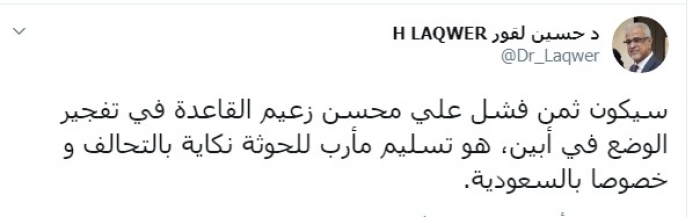 وكتب لقور عبر تغريدة له على "تويتر" رصدها " المشهد العربي":"سيكون ثمن فشل علي محسن زعيم القاعدة في تفجير الوضع في أبين، هو تسليم مأرب للحوثة نكاية بالتحالف و خصوصا بالسعودية".