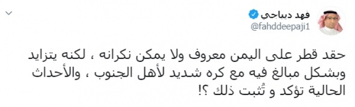 وكتب ديباجي عبر تغريدة له على "تويتر" رصدها " المشهد العربي":"حقد قطر على اليمن معروف ولا يمكن نكرانه ، لكنه يتزايد وبشكل مبالغ فيه مع كره شديد لأهل الجنوب ، والأحداث الحالية تؤكد و تُثبت ذلك ؟!"