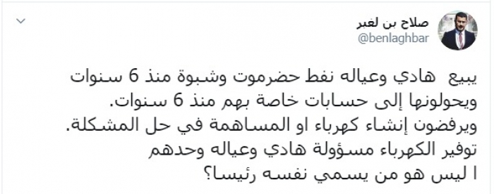 وكتب لغبر عبر تغريدة له على "تويتر" رصدها " المشهد العربي":"يبيع هادي وعياله نفط حضرموت وشبوة منذ 6 سنوات ويحولونها إلى حسابات خاصة بهم منذ 6 سنوات".