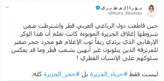 وكتبت المطيري عبر تغريدة لها على "تويتر" رصدها " المشهد العربي":"حين قاطعت دول الرباعي العربي قطر واشترطت ضمن شروطها إغلاق الجزيرة الموبوءة كانت تعلم أن هذا الوكر الإرهابي الذي يرتدي زيفاً ثوب الإعلام هو مجرد جحر صغير للمرتزقة الذين يتلونون غير آبهين بشعب قطر وما قد يعكس سلوكهم على الإنسان القطري".