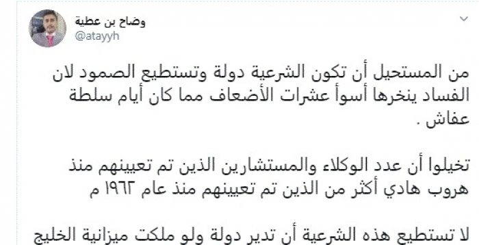 وقال في تغريدة عبر "تويتر" رصدها "المشهد العربي": "من المستحيل أن تكون الشرعية دولة وتستطيع الصمود لأن الفساد ينخرها أسوأ عشرات الأضعاف مما كان أيام سلطة عفاش".